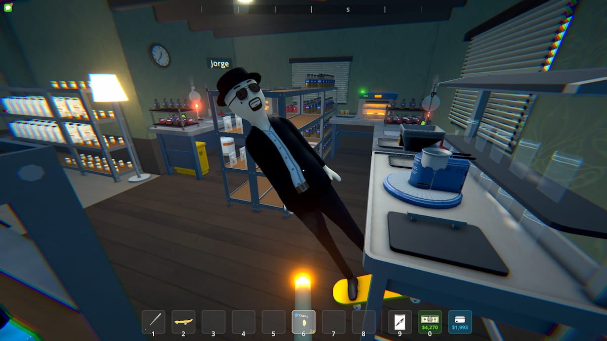 El personaje del jugador en una patineta dorada dentro de un laboratorio de drogas en la lista 1
